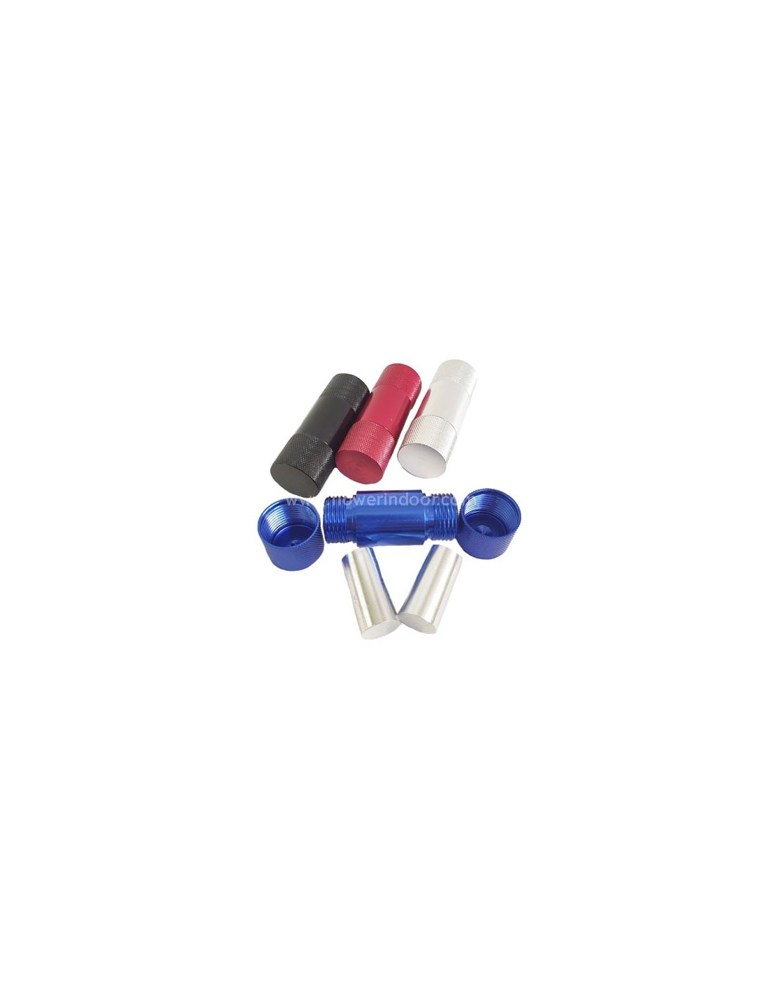 Esta prensa de polen está fabricada en aluminio, y se compone de 5 piezas: el tubo central y dos tapas con rosca en los extremos, y en el interior dos piezas metálicas compactas que se encargan de presionar el polen.