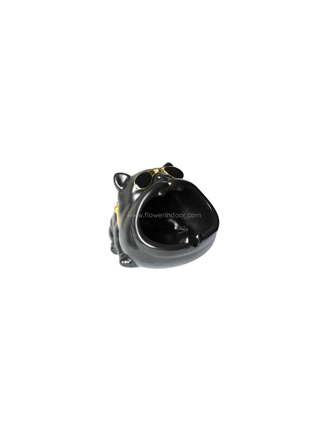 Cenicero con forma de perro con gafas de sol. El perro bulldog tiene la boca muy abierta, creando un espacio para apagar tus cigarros.