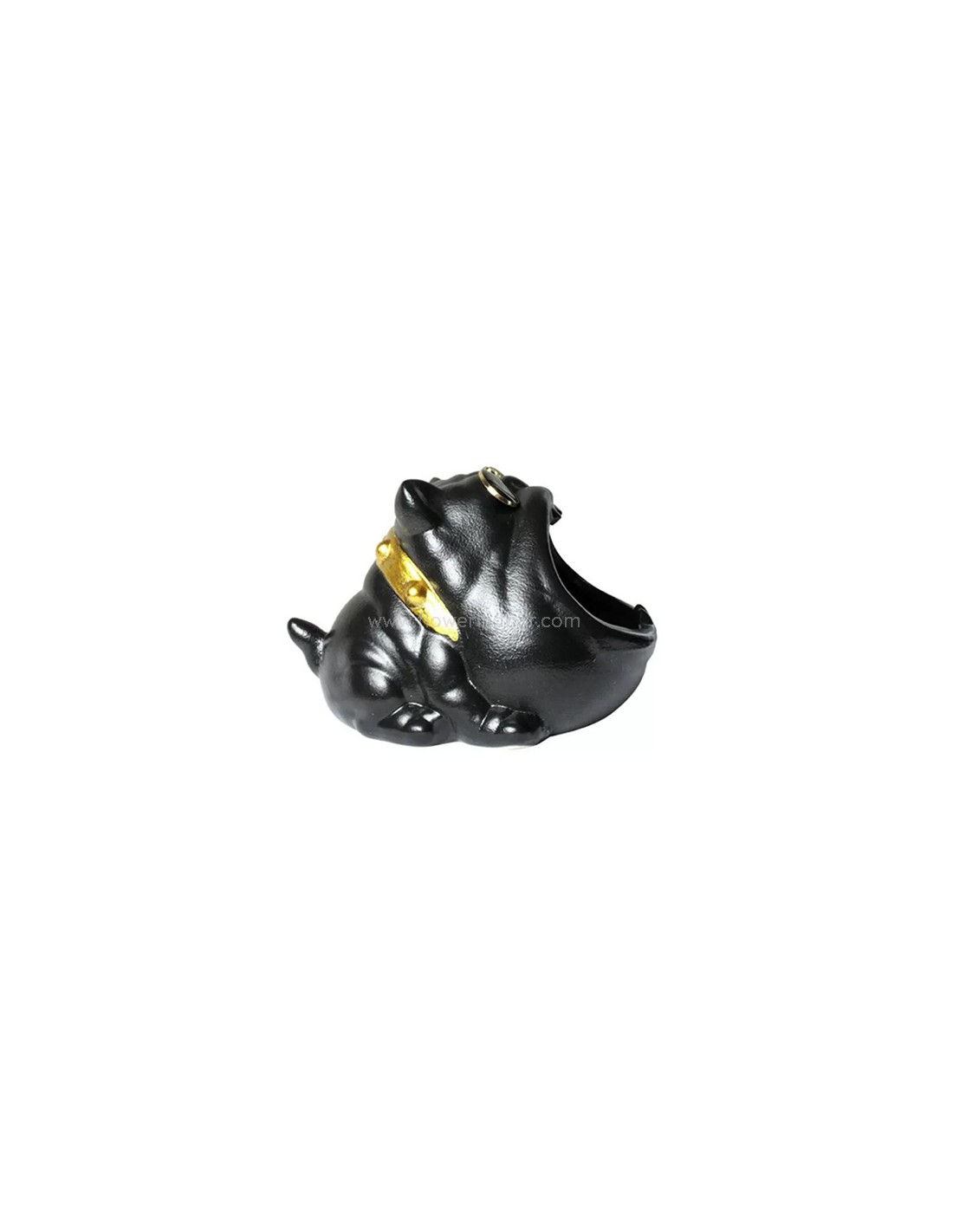 Cenicero de cerámica color negro, con forma de bulldog francés con boca abierta y con gafas y collar dorados.