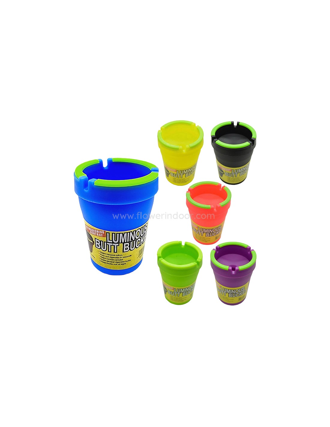 Cenicero contenedor de plástico con una franja en el borde que brilla en la oscuridad.