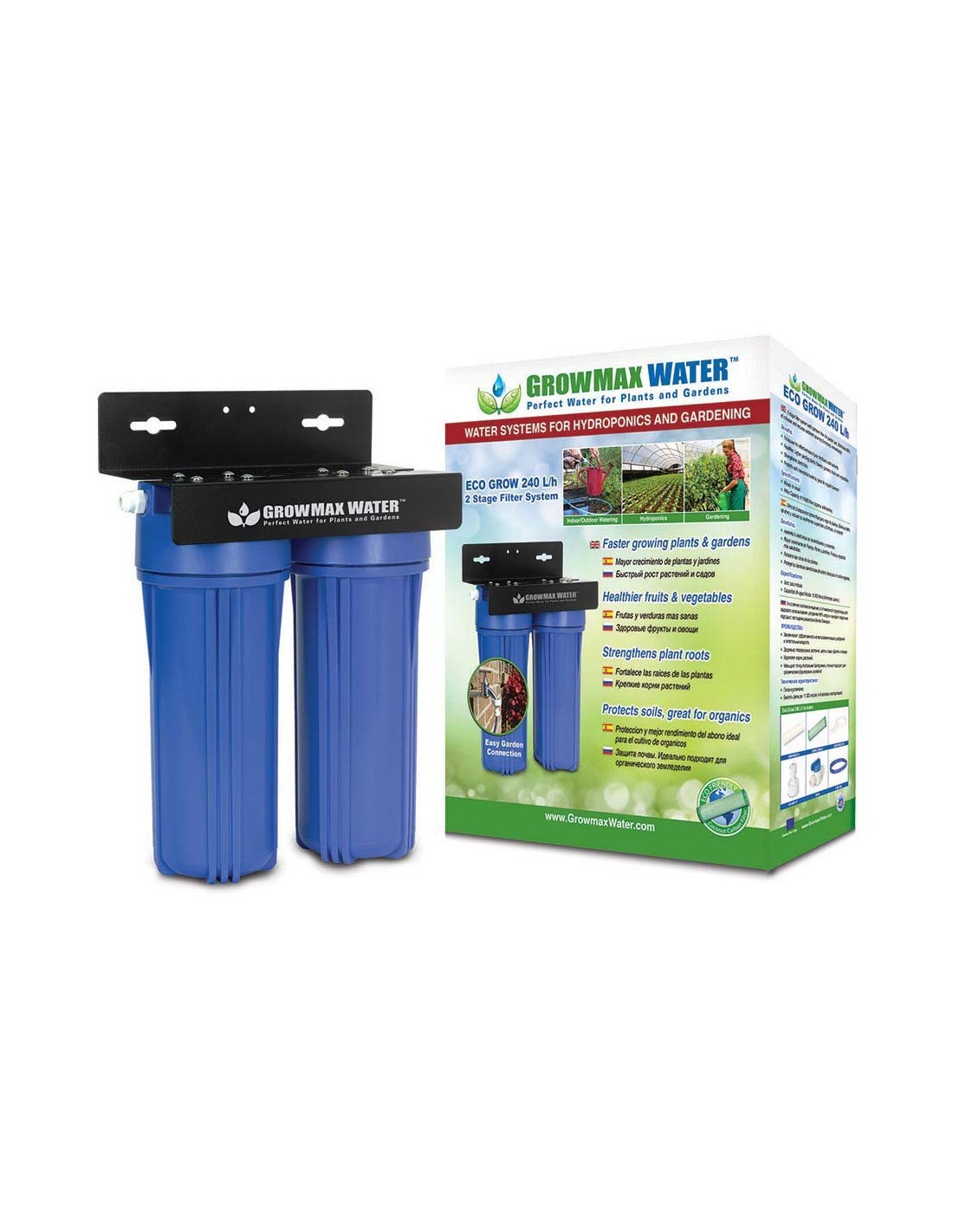 El filtro de agua Eco Grow 240 de GrowMax es un filtro de dos etapas que está indicado principalmente para pequeños cultivos, resultando ideal para plantas de interior y pequeños jardines.